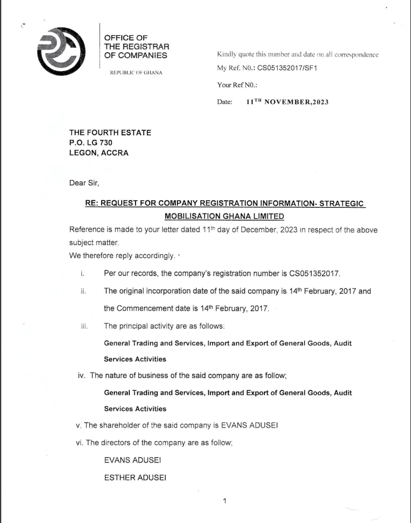 Information The Fourth Estate obtained from the Office of the Registrar of Companies shows that Evans Adusei is the sole shareholder of SML. Also, Evans Adusei and his daughter, Esther Adusei, are the directors of the company. SML’s principal activities are “general trading and services, import and export of general goods and audit service activities.”