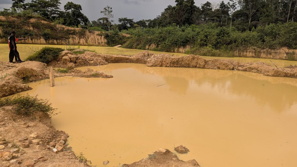“Look at the spent shells,” he said, pointing to bullet casings scattered on the ground. “This shows the people mining here illegally are armed.” Pointing to the gaping, flooded holes, he added: “cocoa can last on the land for decades. But it won’t take two years for them to finish mining the gold. After that, our land will be destroyed forever. Our plea is that the government should reserve these lands for farming.”