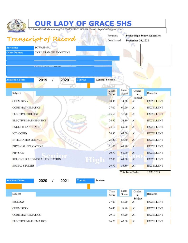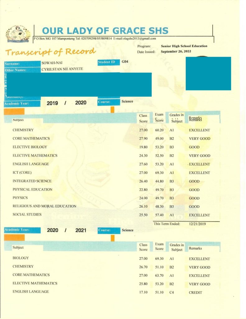 Nurudeen (not his real name) also applied for admission into American Universities through Wise Consult. Nurudeen, also a former OLAG student, obtained admission to most of the schools he applied for, but as his family couldn’t afford to pay the fees, he opted to pursue his first degree in Ghana. If he had gone to study in the United States, he probably would have been arrested, detained, and prosecuted on the same charges as those Cyrilstan faced. It was only after he got news of his former mate’s ordeal that Nurudeen discovered that the documents uploaded on his behalf by Wise Consult were forged. His transcripts also bore only the signature of the OLAG school administrator, Felix Tengan, with better grades than what was on the original transcript.