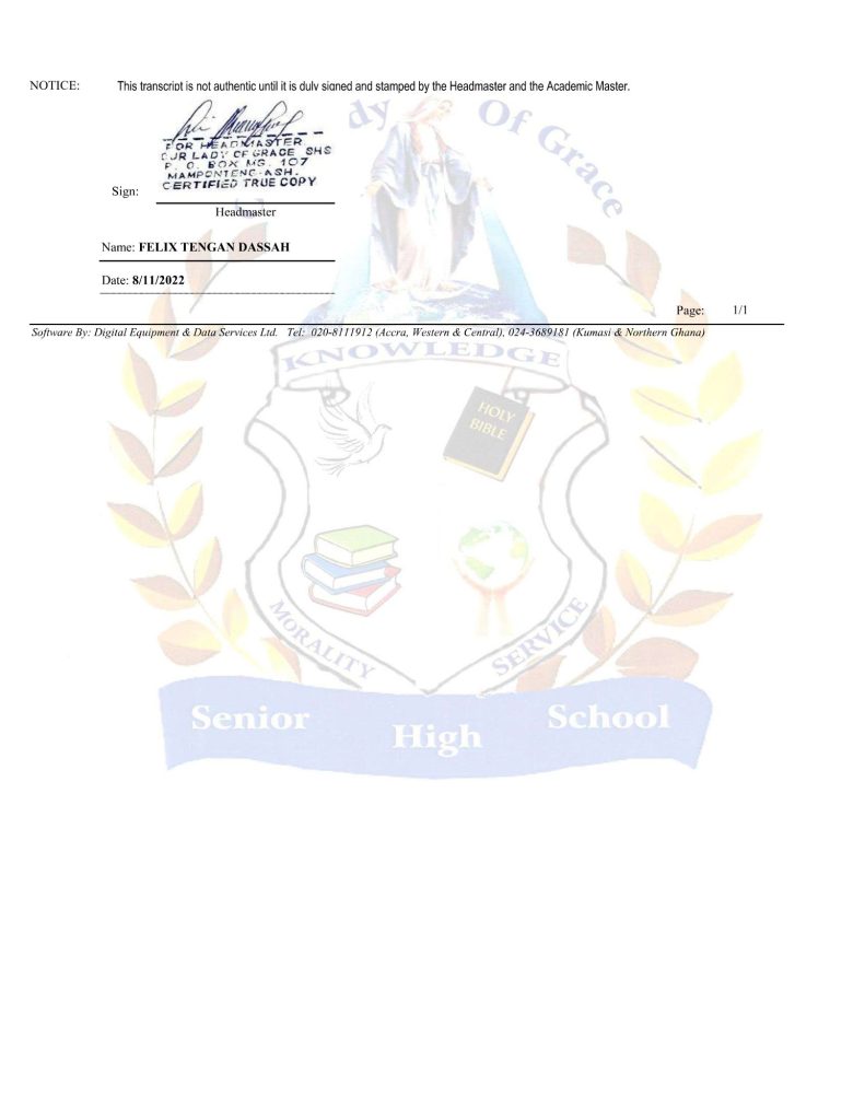 The transcript signed by Felix Tengan Dassah contained grades that were significantly better compared to the others. In addition, Cyrilstan’s mother, Linda Nyuur, confirmed that some of the personal information on the transcript signed by Felix Tengan was inaccurate.